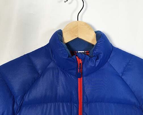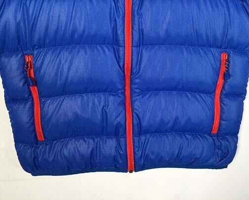 【特長】シングルキルト構造/ダウンプルーフ加工/ジッパーがあごに当たらない仕様/ジッパー付きポケット2個(腰2)